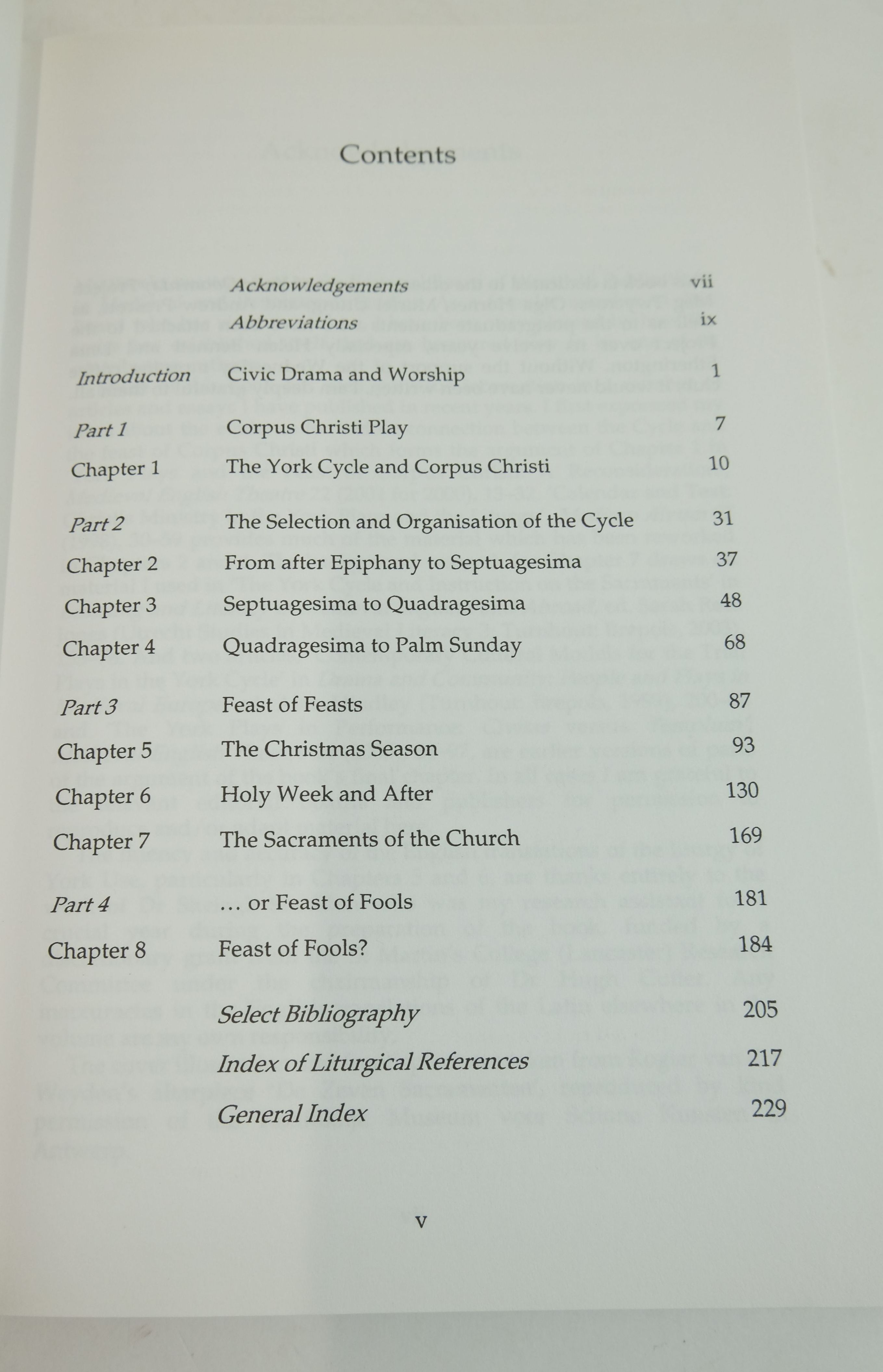 Fine condition in a nearly fine dustwrapper. The York Play is the earliest near-complete English civic mystery cycle. This study uncovers the Cycle's connection with worship in York, in the sense both of devotional practice and of civic honour, informatin a particular period in the cultural history of the city. Red cloth boards, gilt title to spine. Colour frontis.