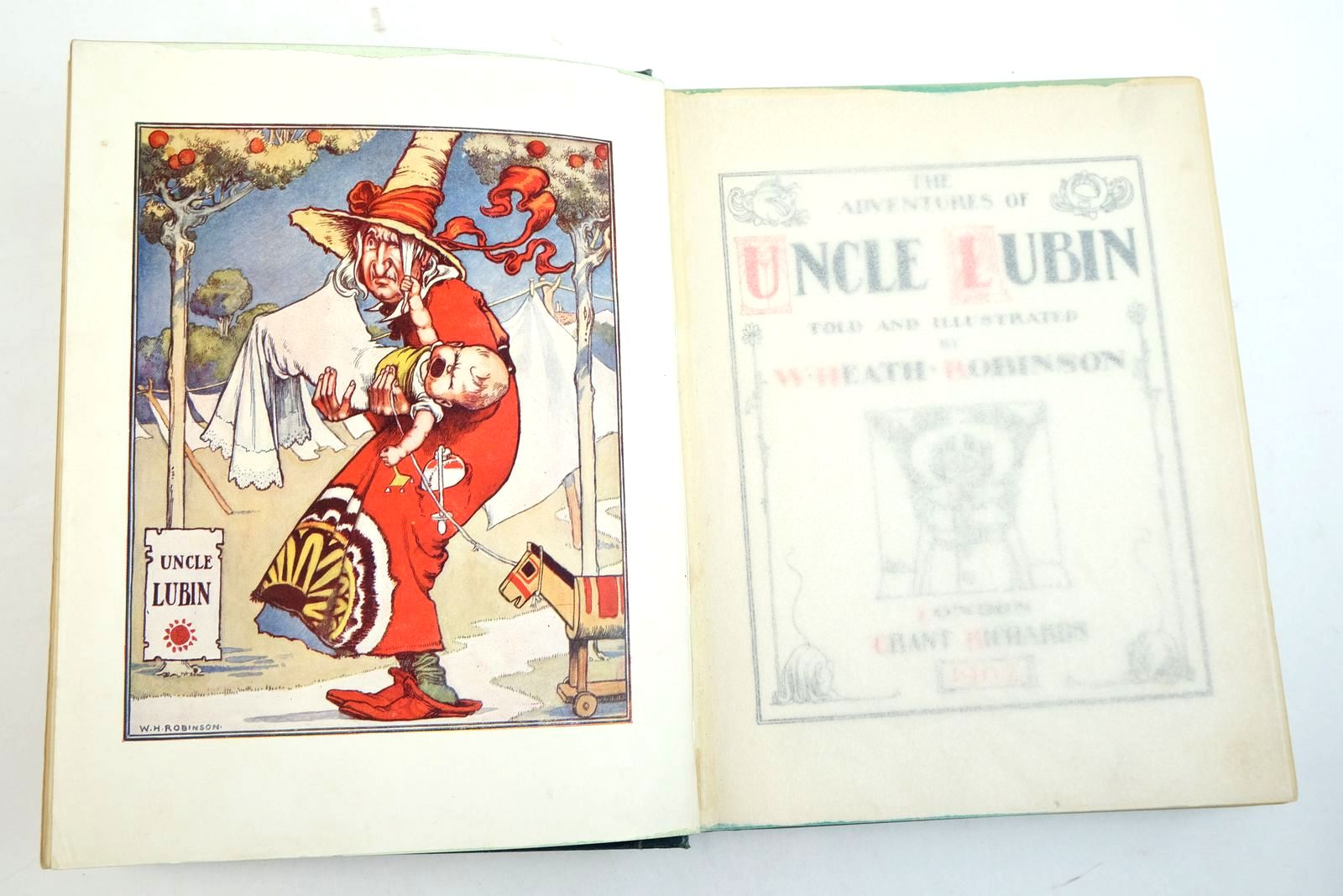 Almost very good condition. The twelve adventures of the brave and good Uncle Lubin. Blue/green decorated cloth with cream/red/beige titles/decorations. Colour frontis, b/w plates and illustrations.
