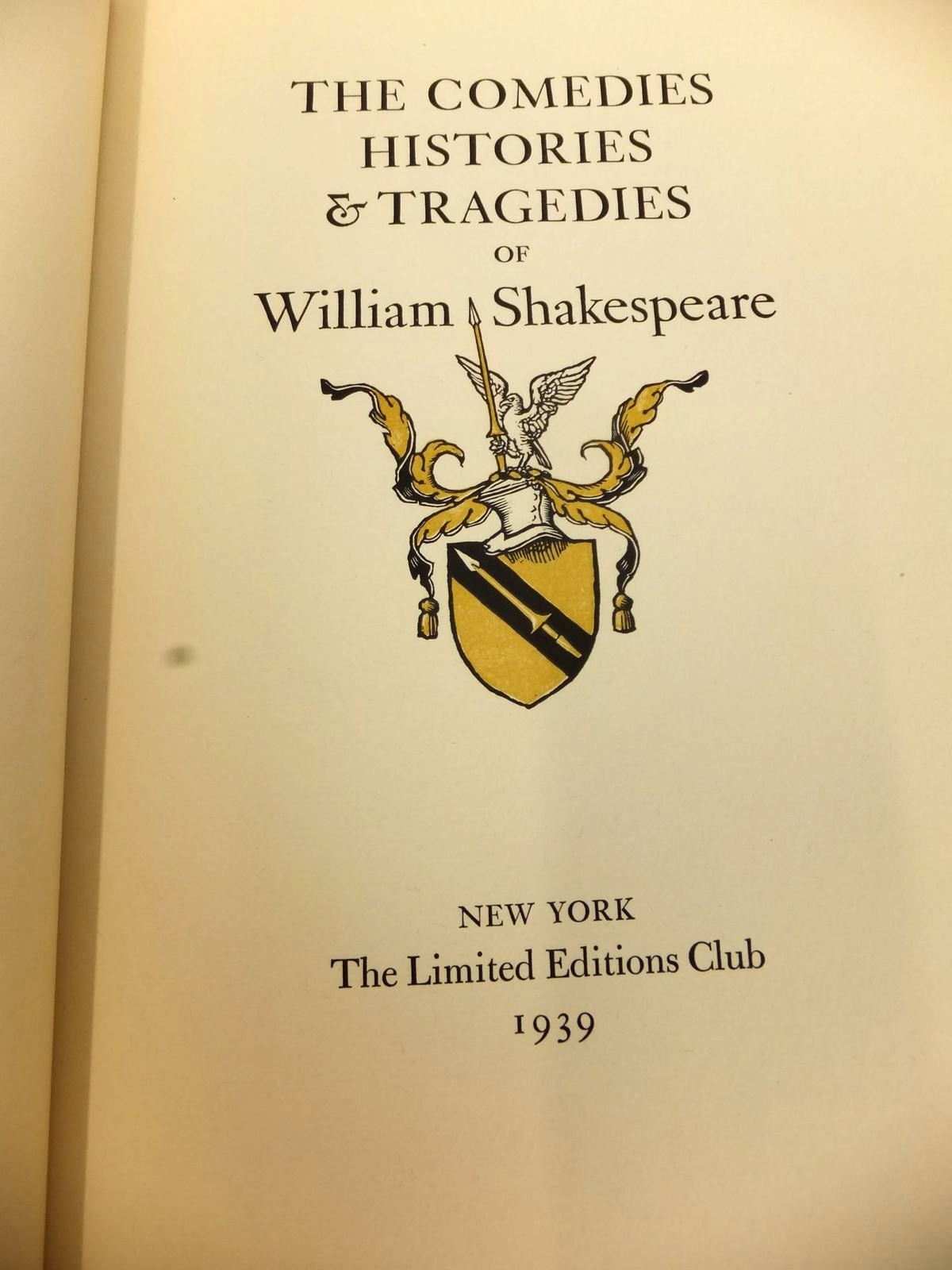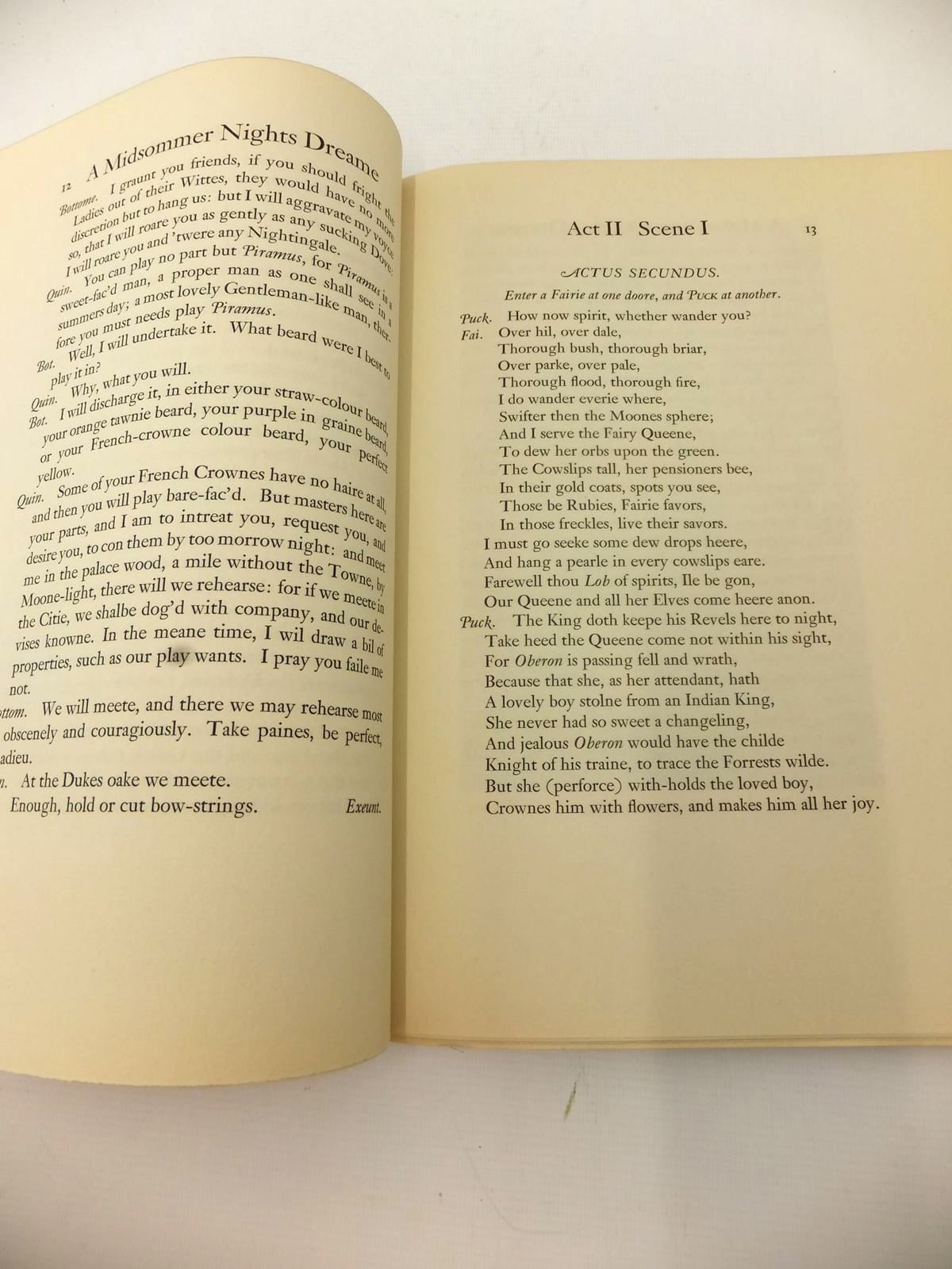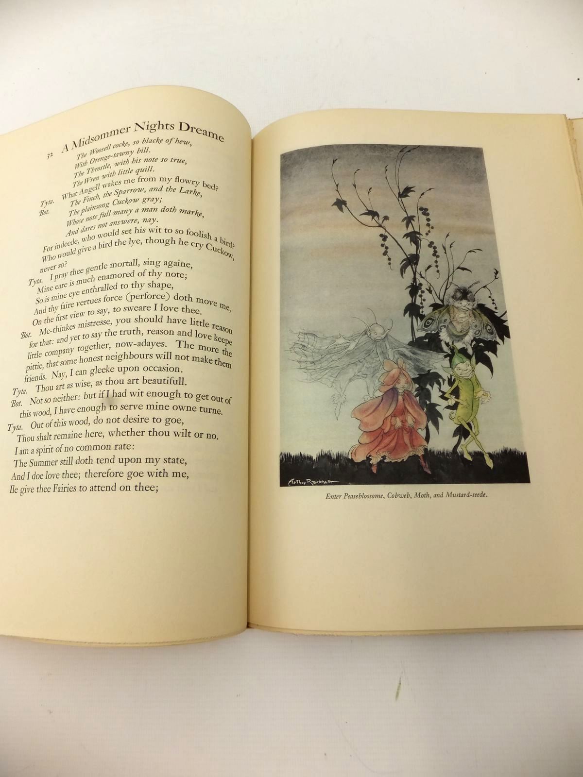 Fine condition in a very good dustwrapper. One volume of 'The Plays of William Shakespeare in thirty-seven volumes'. First title page after half-title: 'The Comedies Histories & Tragedies of William Shakespeare'. Large format. Illustrated with 6 beautiful watercolour illustrations by Rackham. Cloth backed decorative boards. 74pp uncut. Top edge gilt. 13" x 9". Limited to 1950 numbered copies.