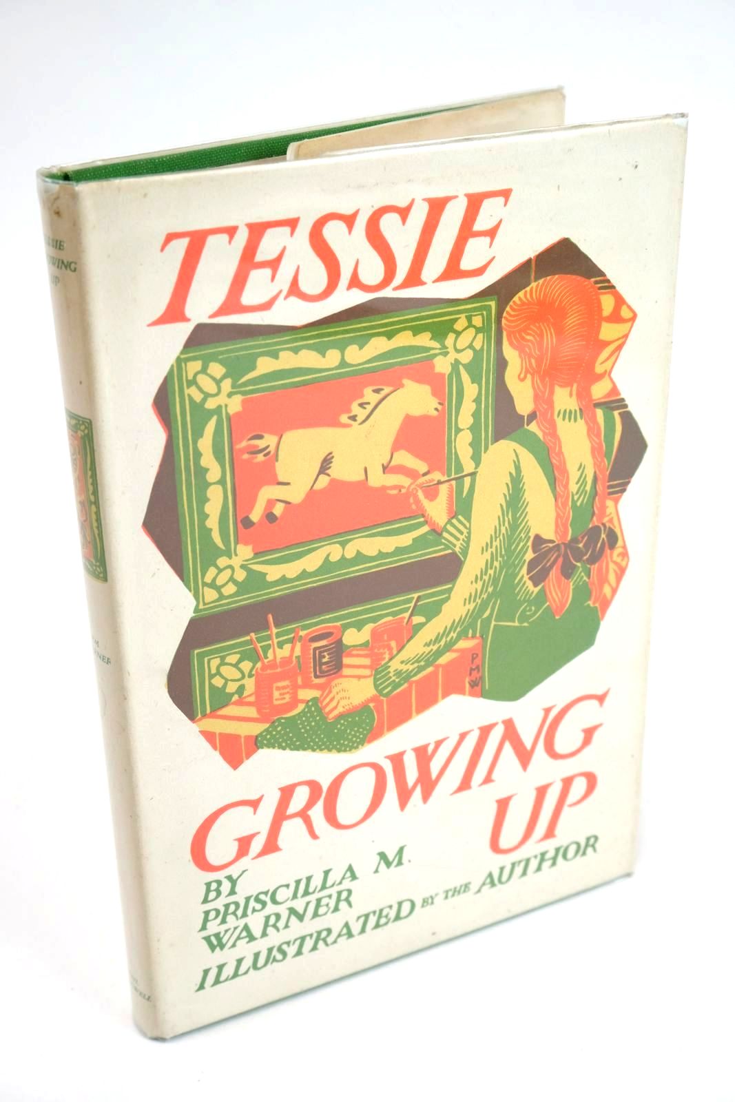 Tessie saves a caravan from destruction and it helps her to travel a considerable distance along the difficult road of growing up, and establishes her more firmly than ever in her resolve to be an artist. Green cloth, gilt title to spine. 189 pages. B/w text illustrations. Red illustrations to endpapers. Spine rubbing to spine. Pale foxing to text block. White pictorial wrapper is slightly rubbed at spine and corners and is very slightly browned to spine with a small (very light) damp stain to centre.