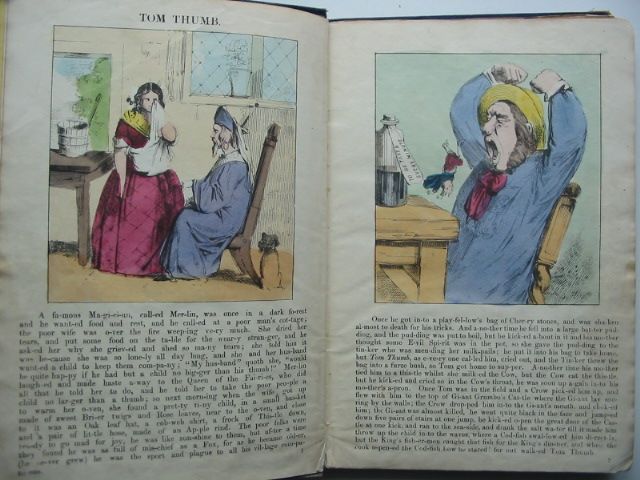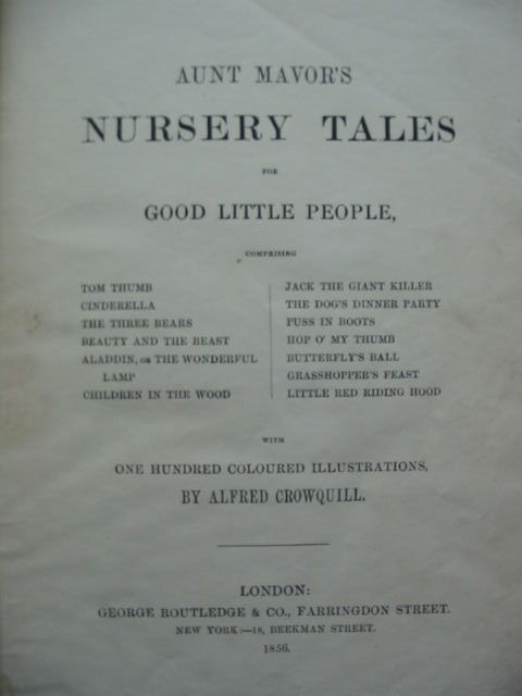 Good condition. Comprising: Tom Thumb; Cinderella; The Three Bears (featuring Silverlocks); Beauty and the Beast; Aladdin; Children in the Wood; Jack the Giant Killer; The Dog's Dinner Party; Puss In Boots; Hop o' My thumb; Butterfly's Ball; Grasshopper's Feast; Little Red Riding Hood. This is the same publication as the 'Second Series of Aunt Mavor's Picture Books for little Readers' (published in the same year), except that 'The Dog's Dinner Party' is included instead of 'The Nursery Alphabet.' Printed on one side of the page only, every page has a hand-coloured illustration accompanying the test. Each story is 8 pages long. Bound in blue embossed cloth with gilt titles to front cover and spine. Yellow endpapers.