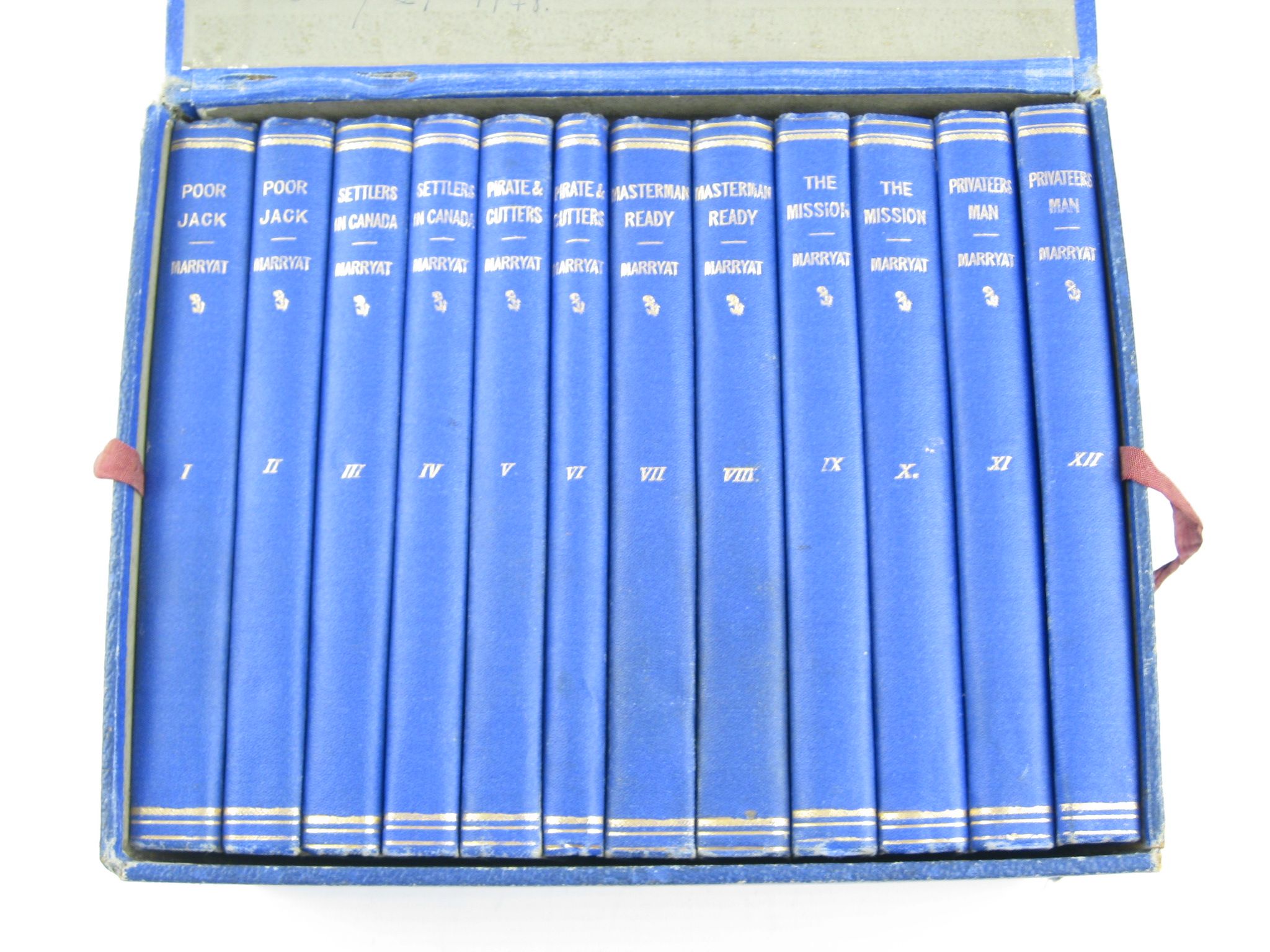 Very good condition. 12 volumes contained in a blue box which has gilt title and vignette to lid. Each volume is small format with gilt title to spine. Two volumes for each story: Poor Jack; Settlers in Canada; The Pirate & The Three Cutters; Masterman Ready; The Mission; The Privateersman.