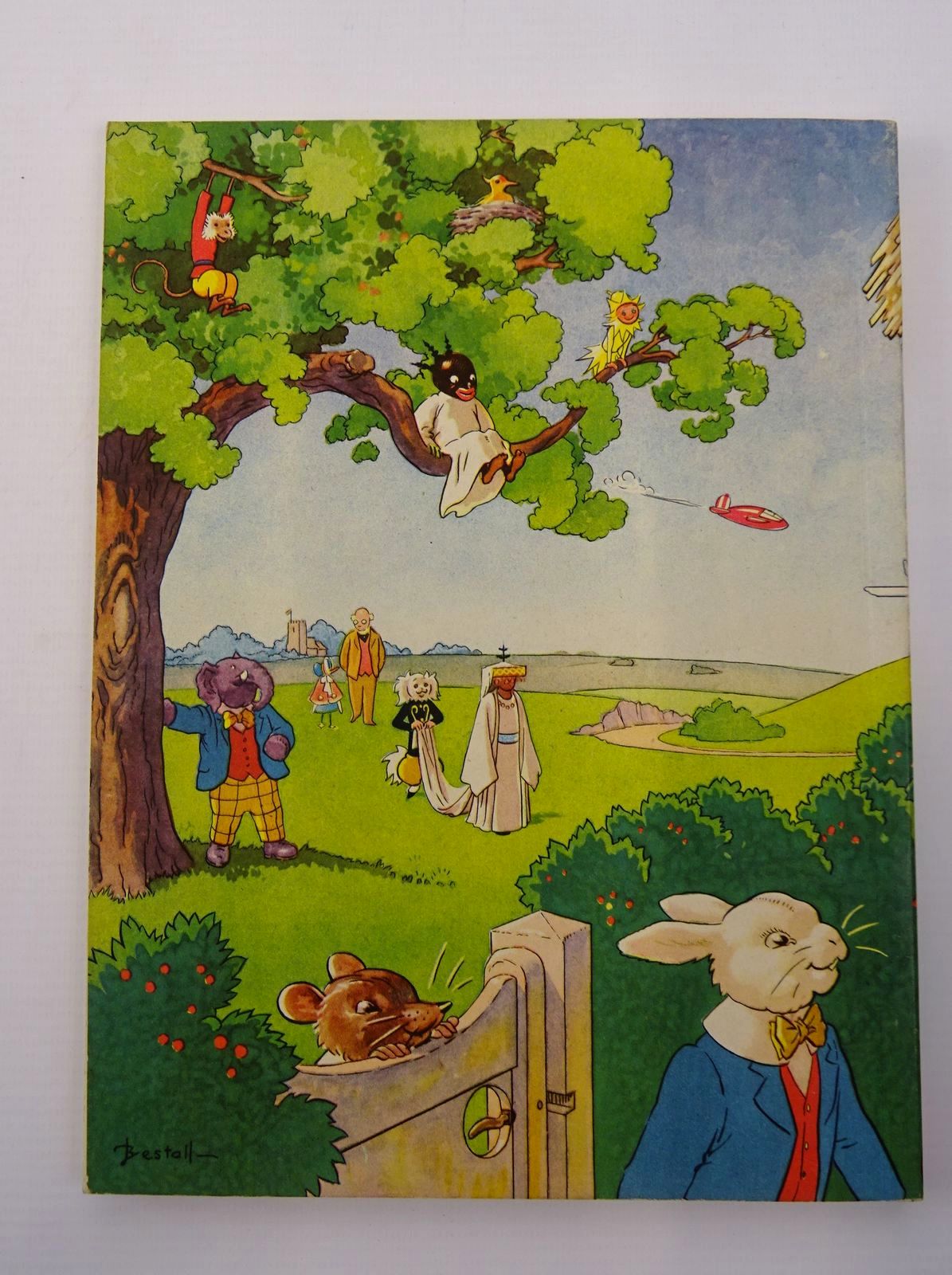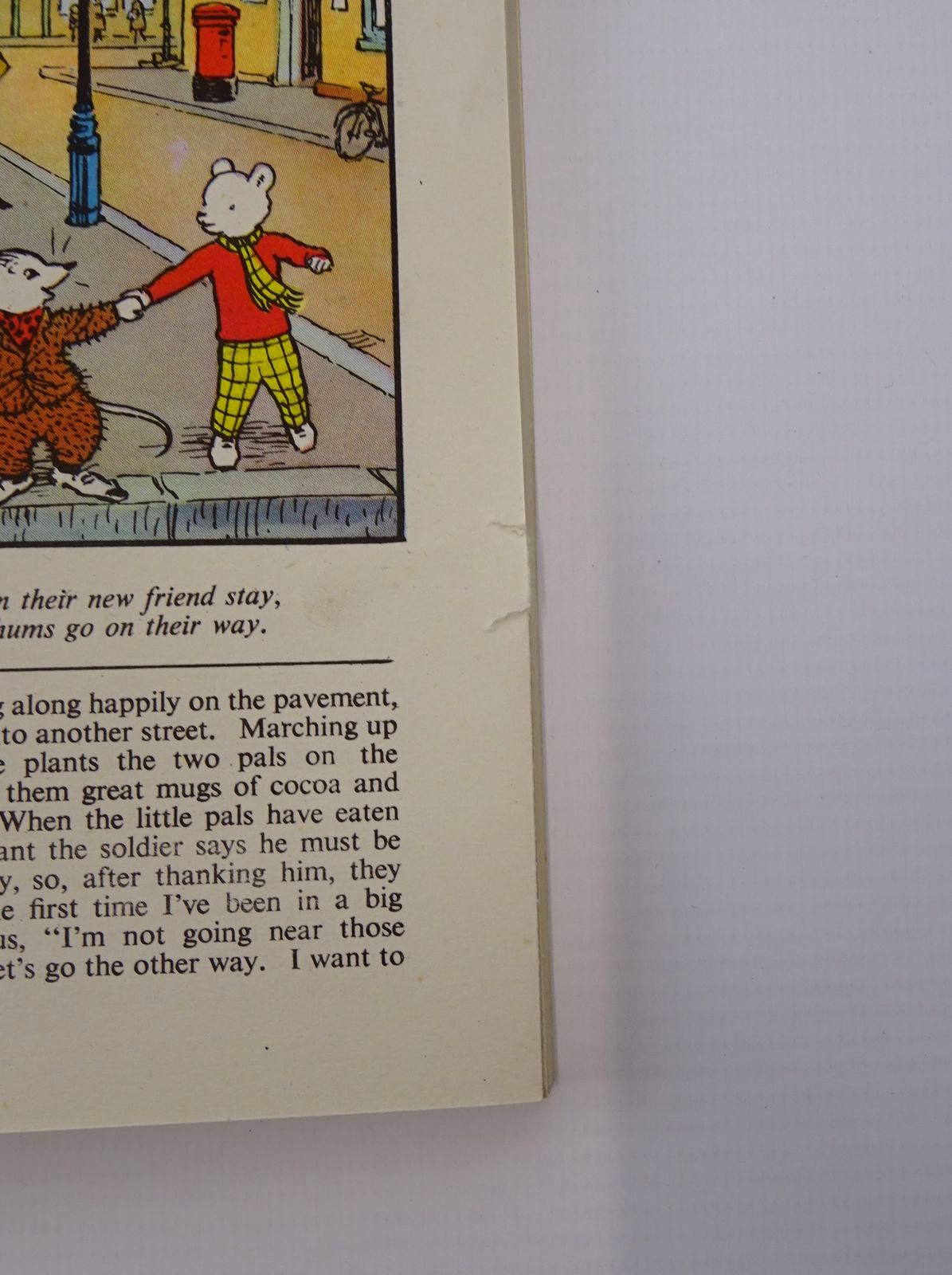 Some slight rubbing to spine and corners. Small (0.75"), light scratch mark to front cover - on second R in Rupert. Otherwise covers bright and clean. Not inscribed or price-cut. Puzzle pages untouched. Two pages were mis-cut during the binding process and have been opened a little roughly causing very small margin tears (pages 27-28 and 29-30). Contents otherwise very bright. A lovely, bright copy of a scarce annual.