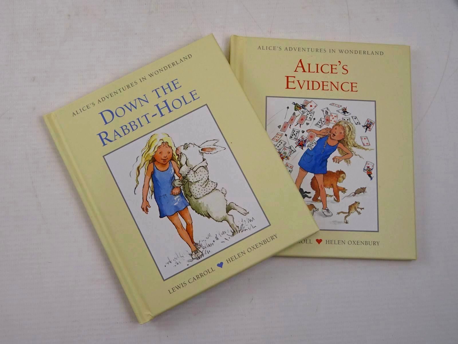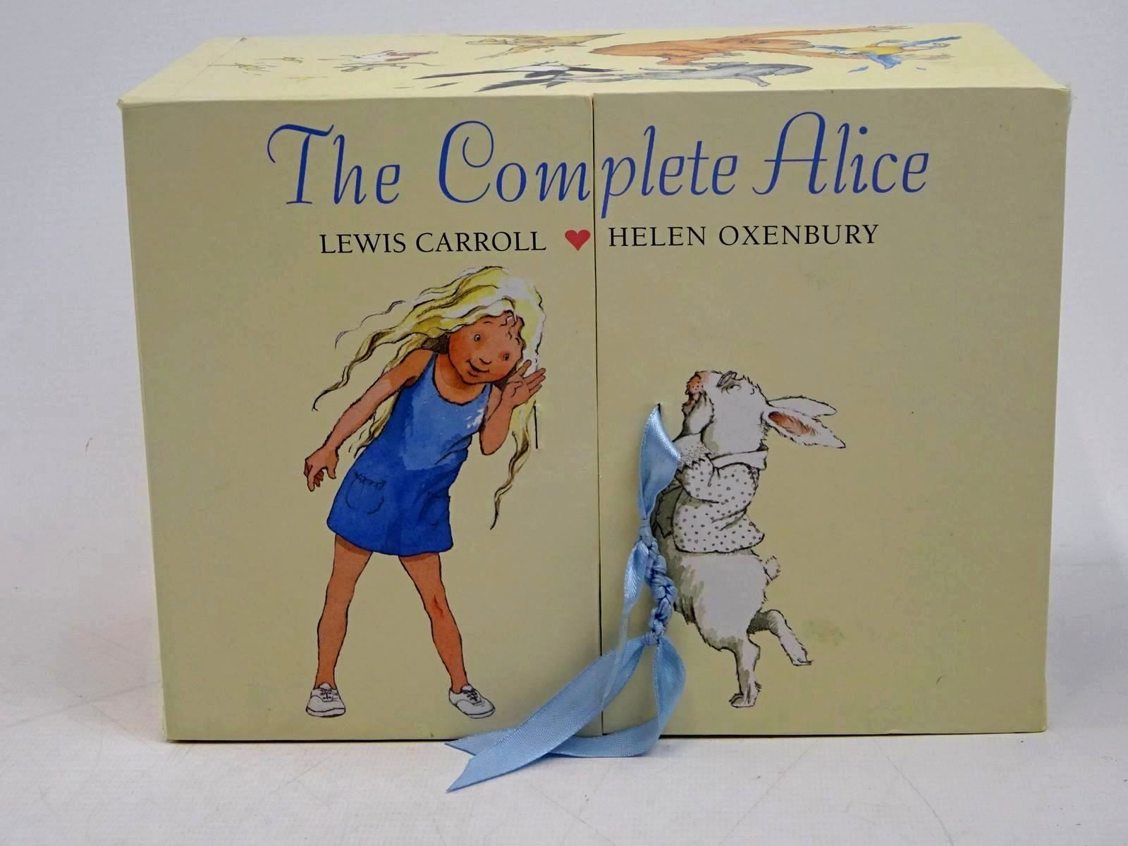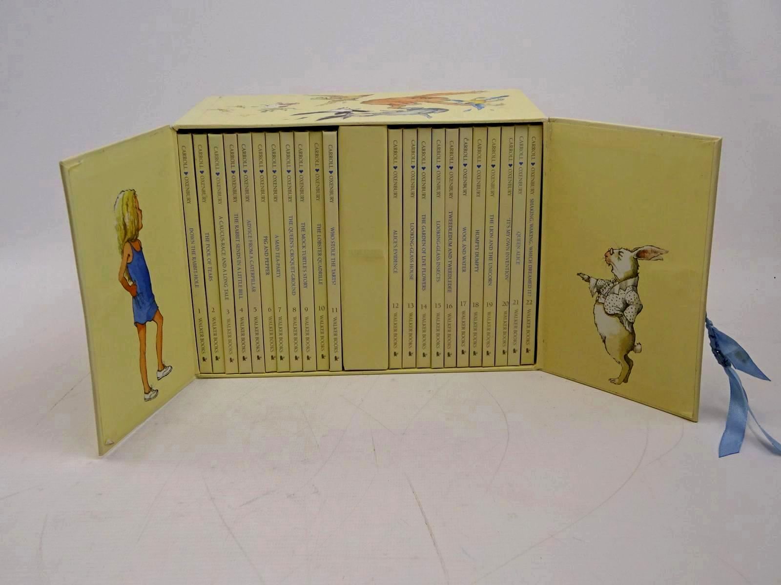 Fine condition. Alice's Adventures in Wonderland & Alice Through the Looking-Glass presented in 22 beautiful volumes (11 for each title). Each volume is a small hardback book with colour and b/w illustrations throughout. Held in a cream pictorial box with blue ribbon ties.