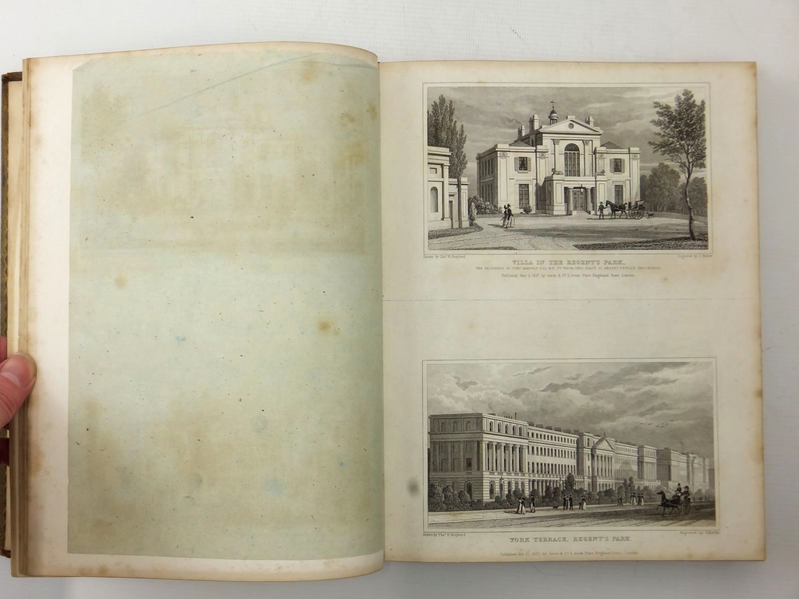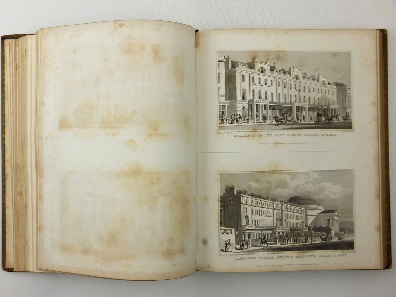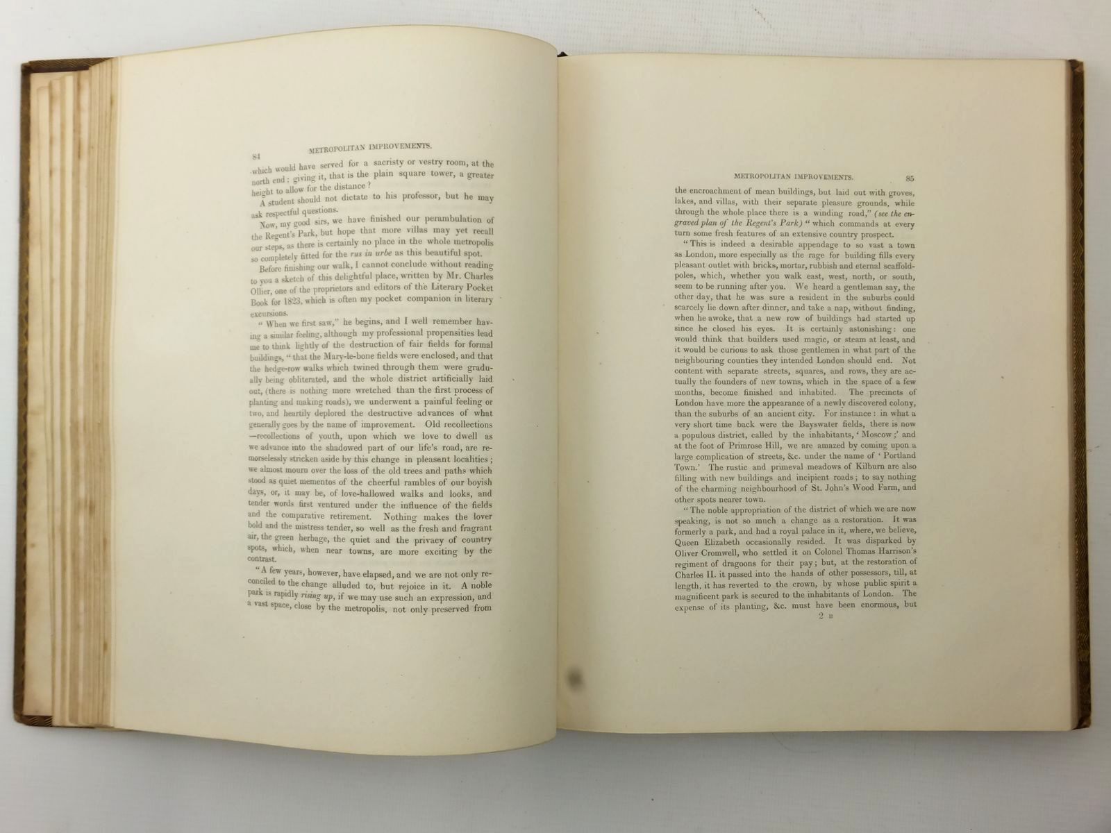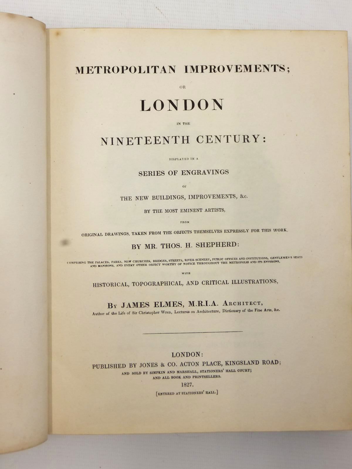 Good condition. Large format. Full brown leather binding with gilt decoration. Burgundy title block to spine with gilt lettering. Marbled endpapers. The New Buildings, Improvements Etc. by the Most Emminent Artists from original drawings taken from the objects themselves expressly for this work. Comprising the Palaces, Parks, New Churches, Bridges, Streets, River Scenery, Public Offices and Institutions, Gentlemen's Seats and Mansions, and Every Other Object Worthy of Notice Throughout the Metropolis and its Environs. With historical, topographical and critical illustrations by James Elmes.
