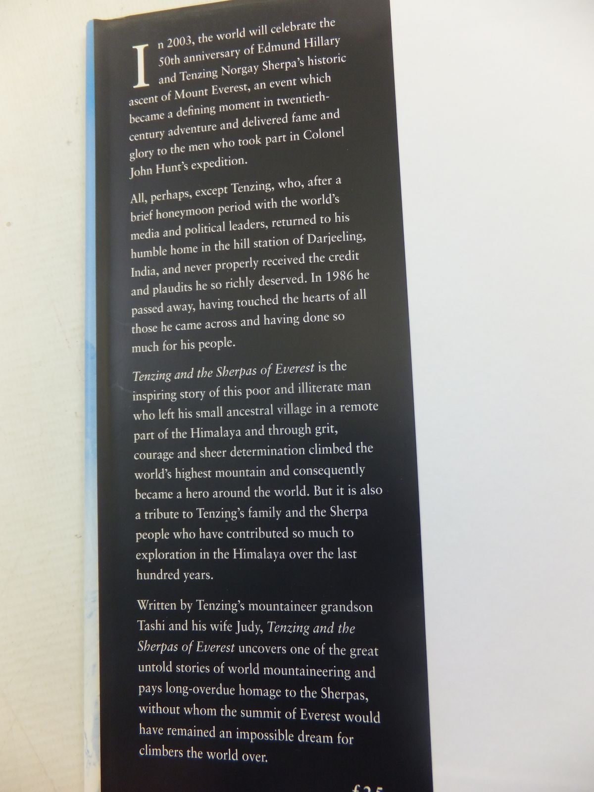 Nearly fine condition in a nearly fine dustwrapper. The inspiring story of Tenzing Norgay Sherpa, a poor and illiterate man, who left his small ancestral village in a remote part of the Himalaya and through grit, courage and sheer determination climbed the world's highest mountain and consequently became a hero around the world. Written by Tenzing's mountaineer grandson and his wife. Blue boards, white title to spine. B/w photos.