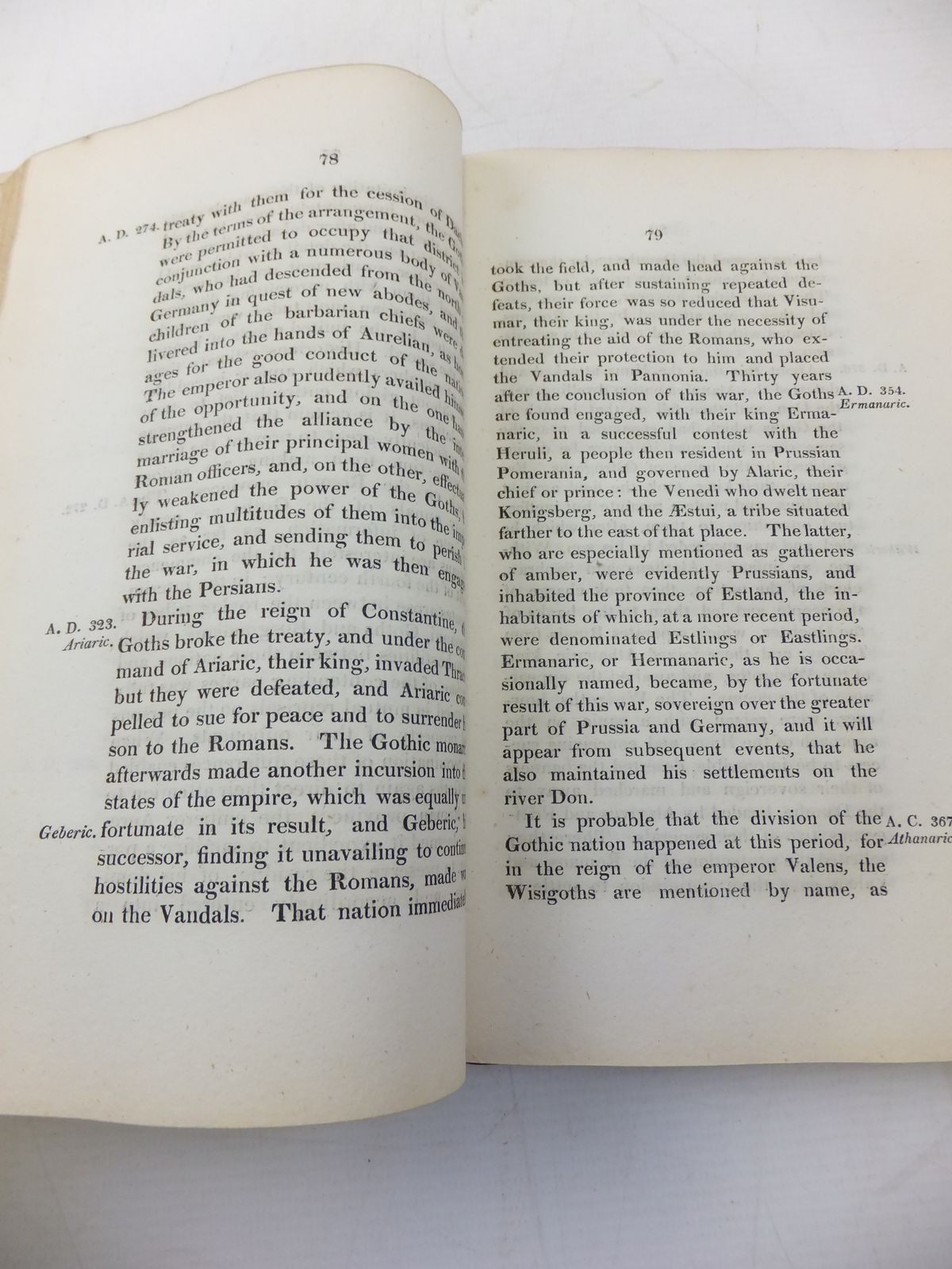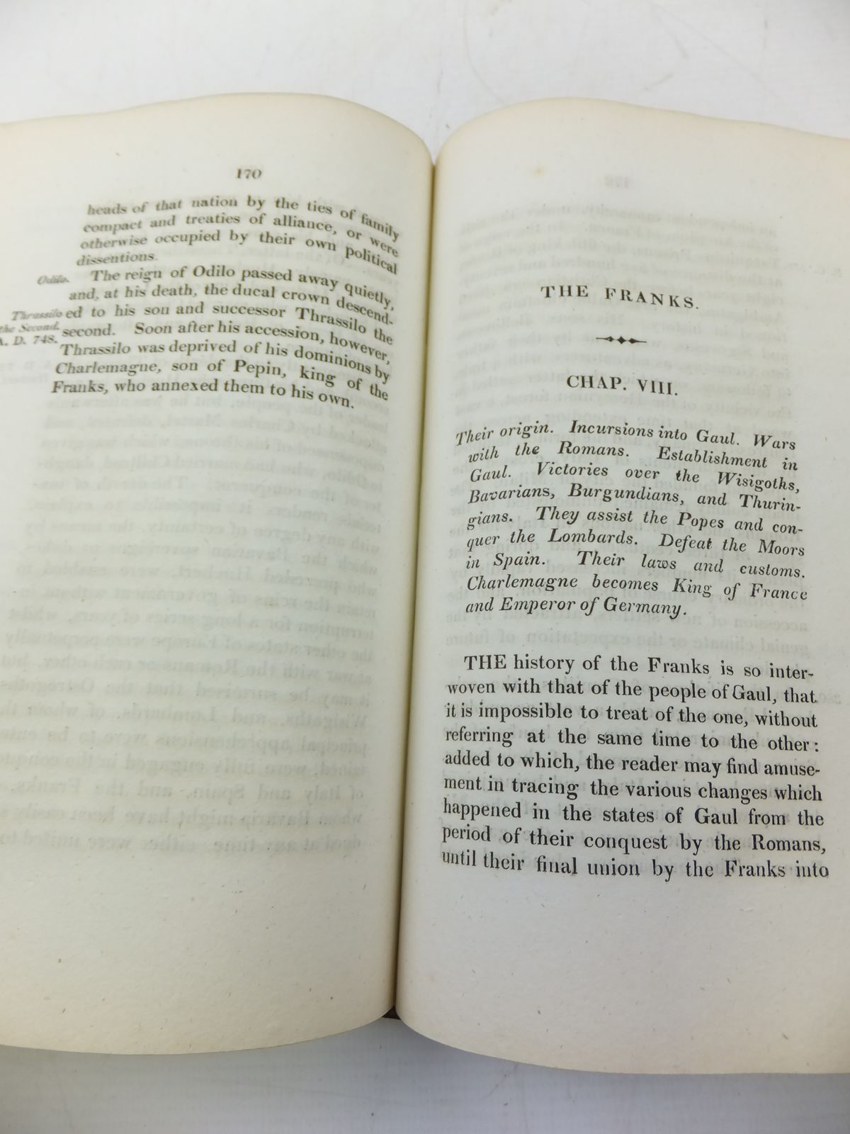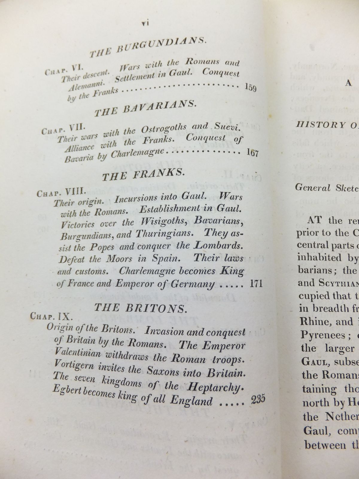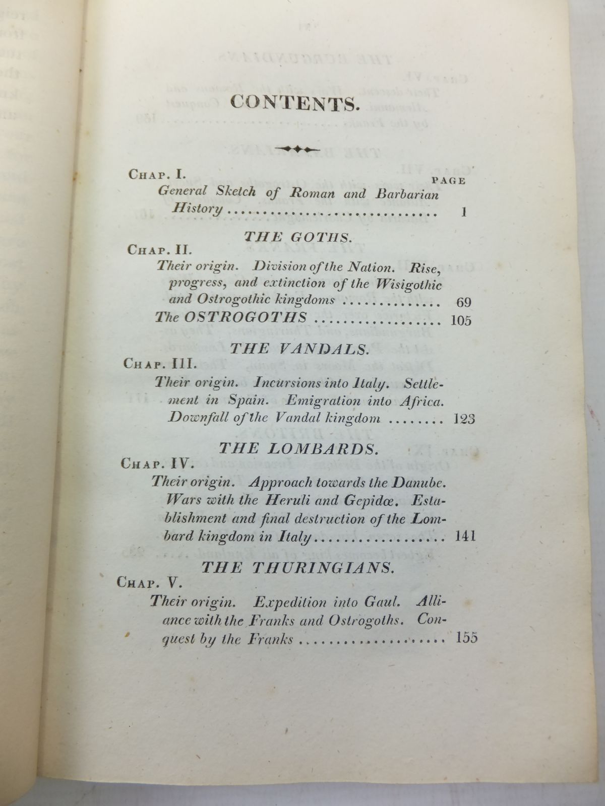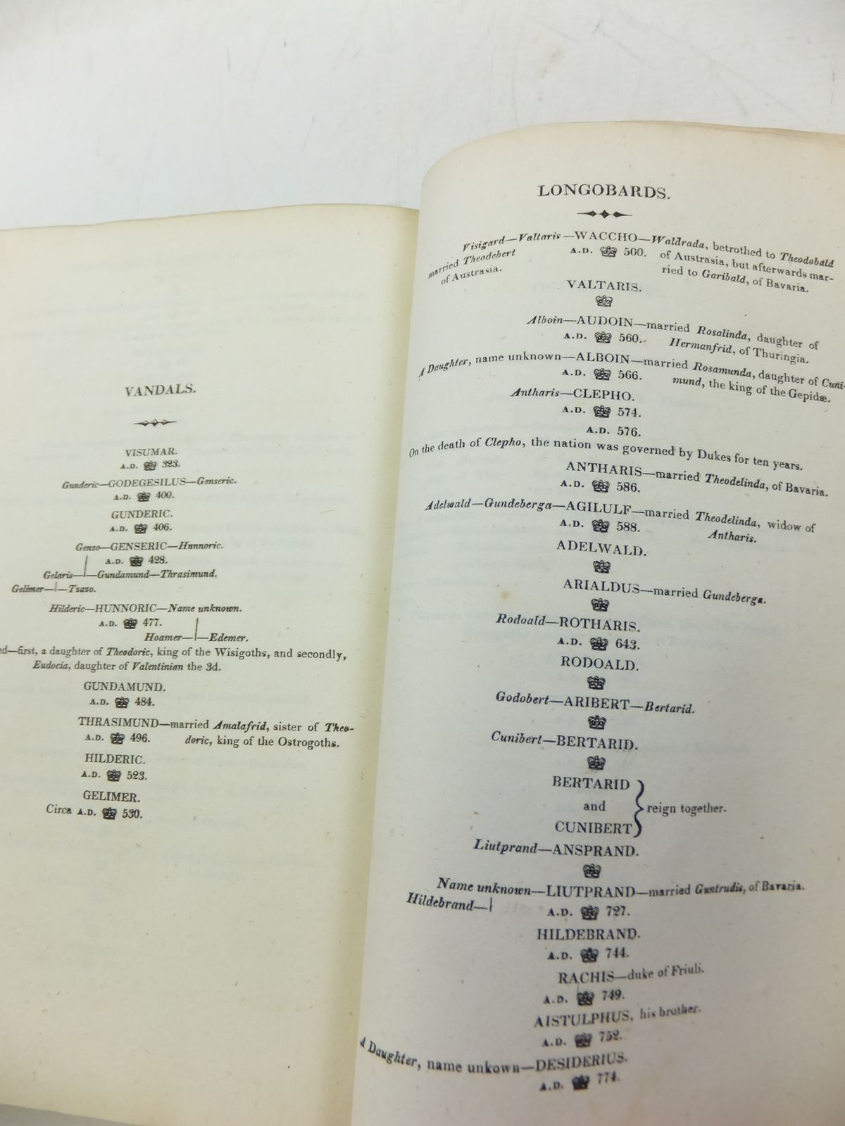 Very good condition. Explanatory of the origin and progress of the following Nations: Goths; Wisigoths; Ostrogoths; Vandals; Lombards; Thuringians; Burgundians; Bavarians; Franks; and Britons. Leather spine and corners, raised bands to spine with gilt title. Green cloth boards. Red text block. vi and 270 pages plus Genealogical tables to rear.