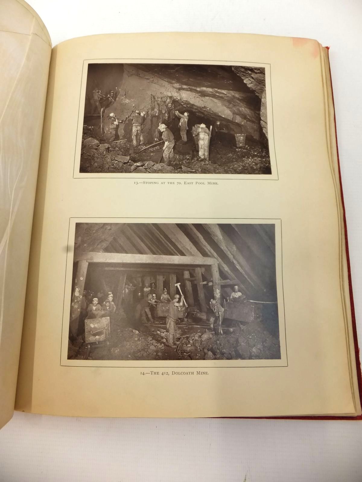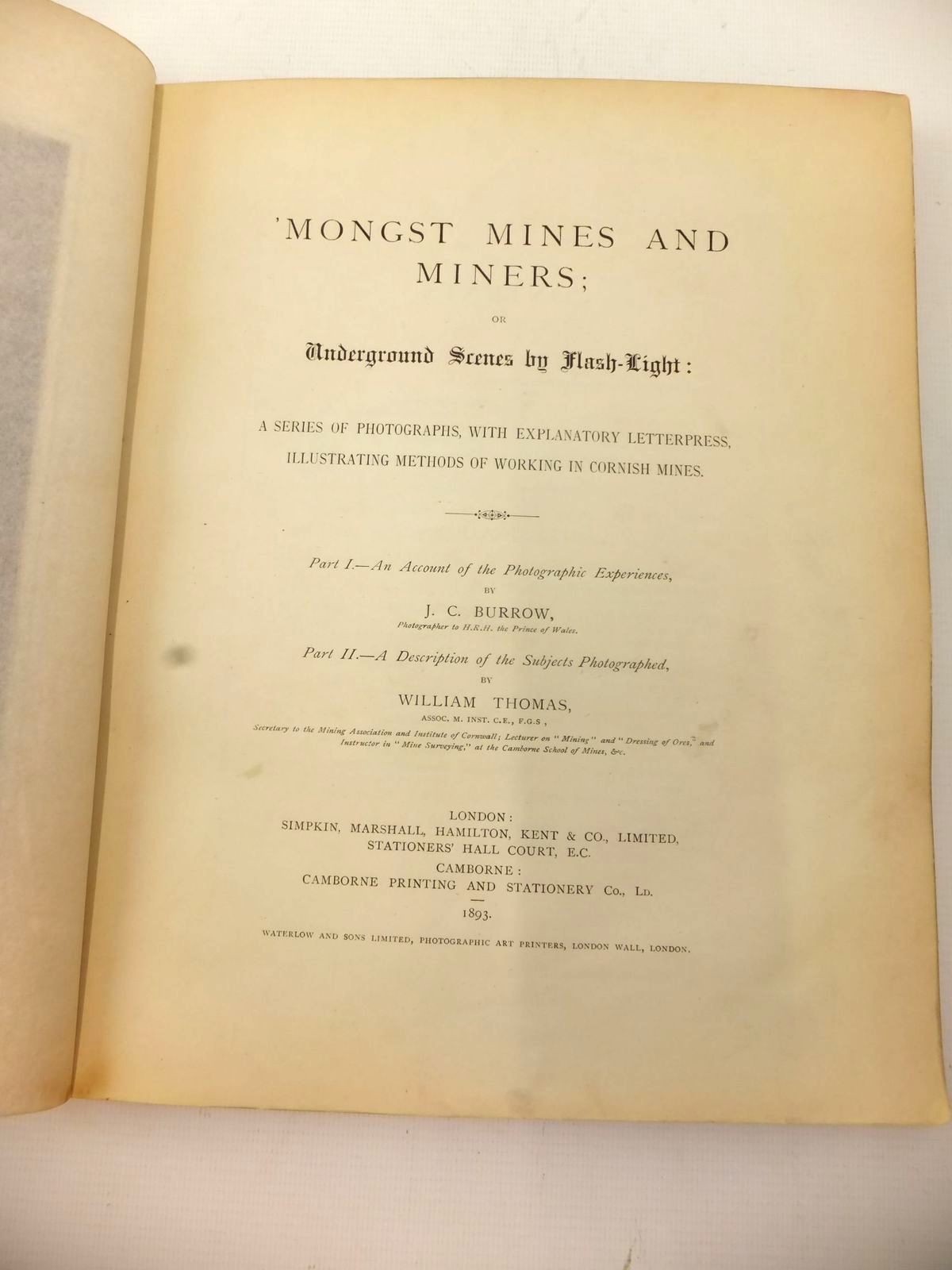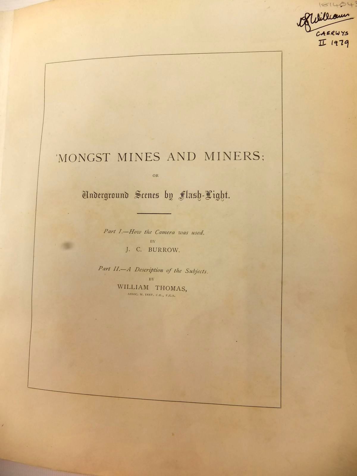 Very good condition. Underground Scenes by Flash-Light: A series of photographs with explanatory letterpress, illustrating methods of working in Cornish mines. Part I: An Account of the Photographic Experiences by J.C. Burrow; Part II: A Description of the Subjects Photographed by William Thomas. Large format. Red cloth boards, gilt titles. Frontis plus 26 b/w mounted photographs with tissue guard, two per page. 32 text pages. All edges gilt.