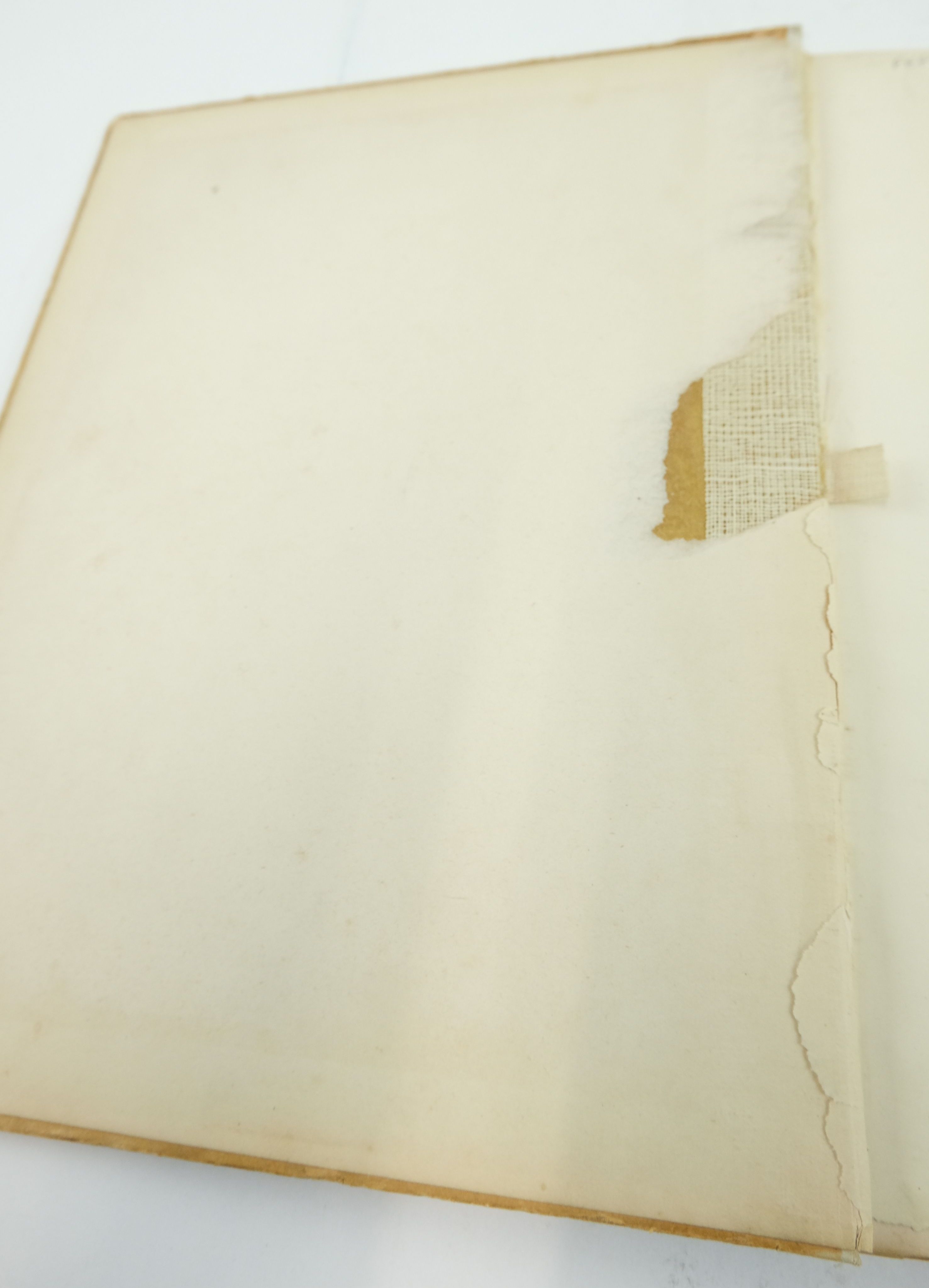 Boards and spine browned, boards scratched. Edges rubbed, corners worn. Front endpaper is MISSING also giving rise to 2" x 1" loss to the front pastedown at spine edged, cloth mull is exposed at front joint. Grubby marks to contents. Tissue guard to frontis is foxed. Hinges pulled but binding otherwise tight. A good reading copy.