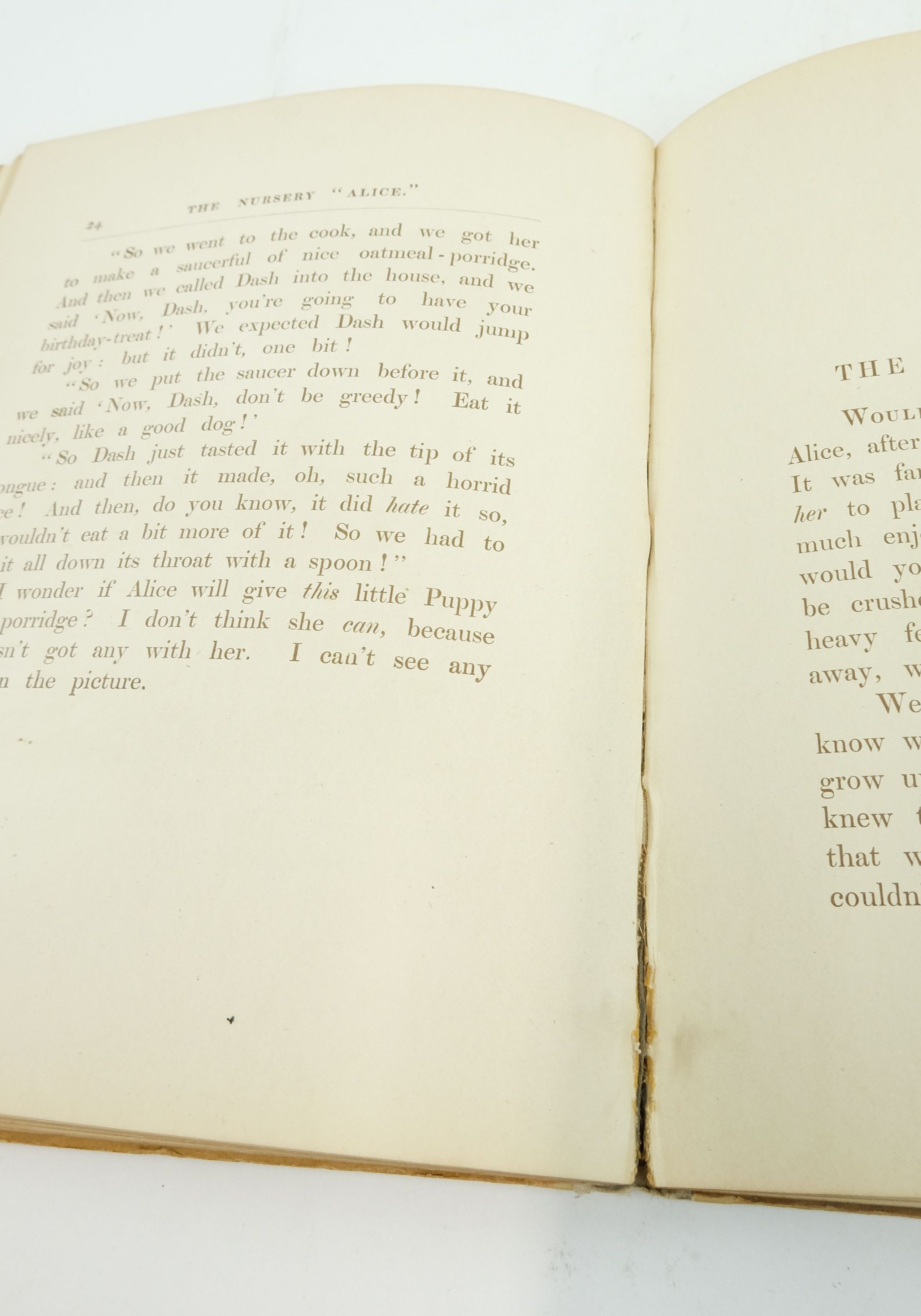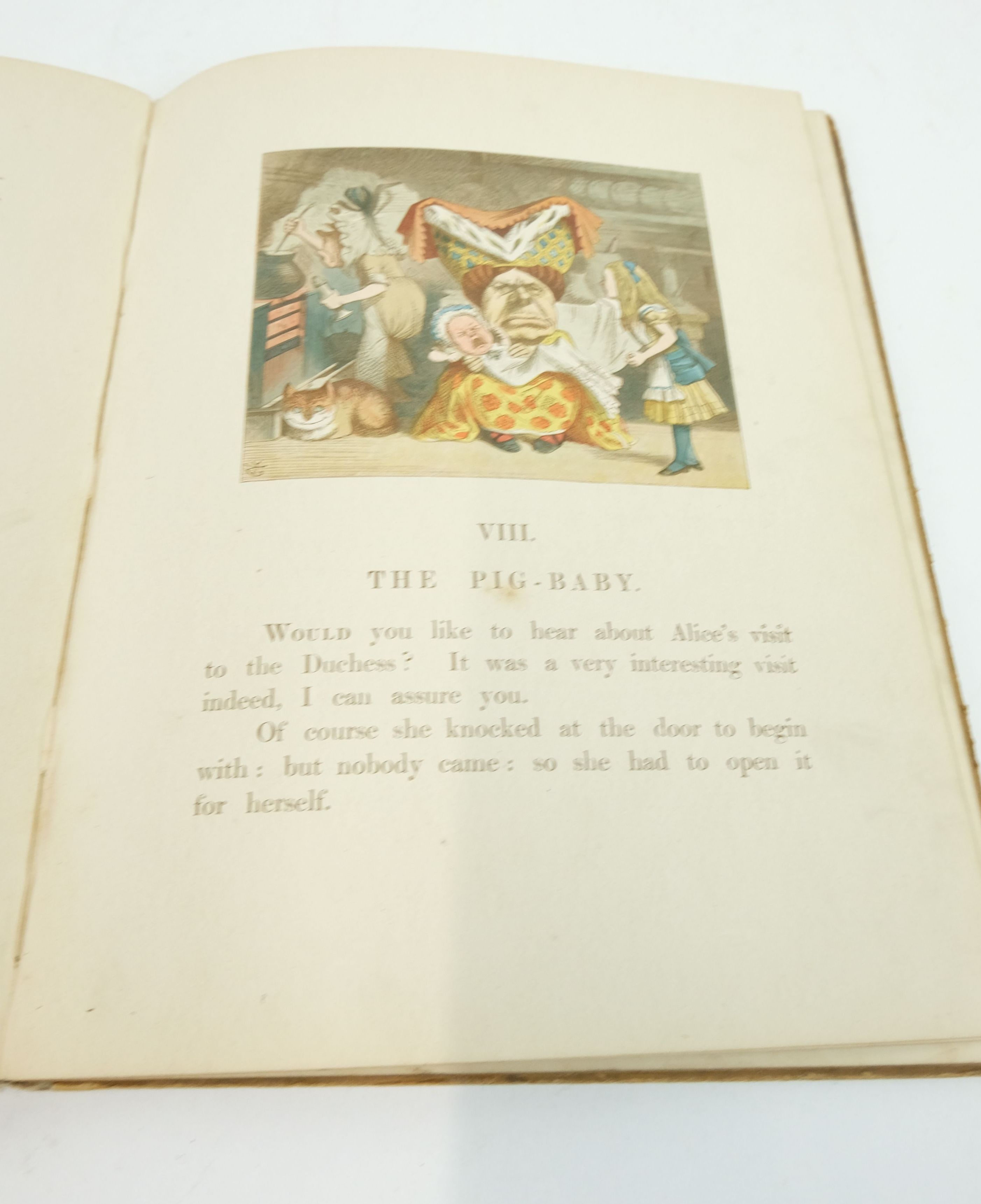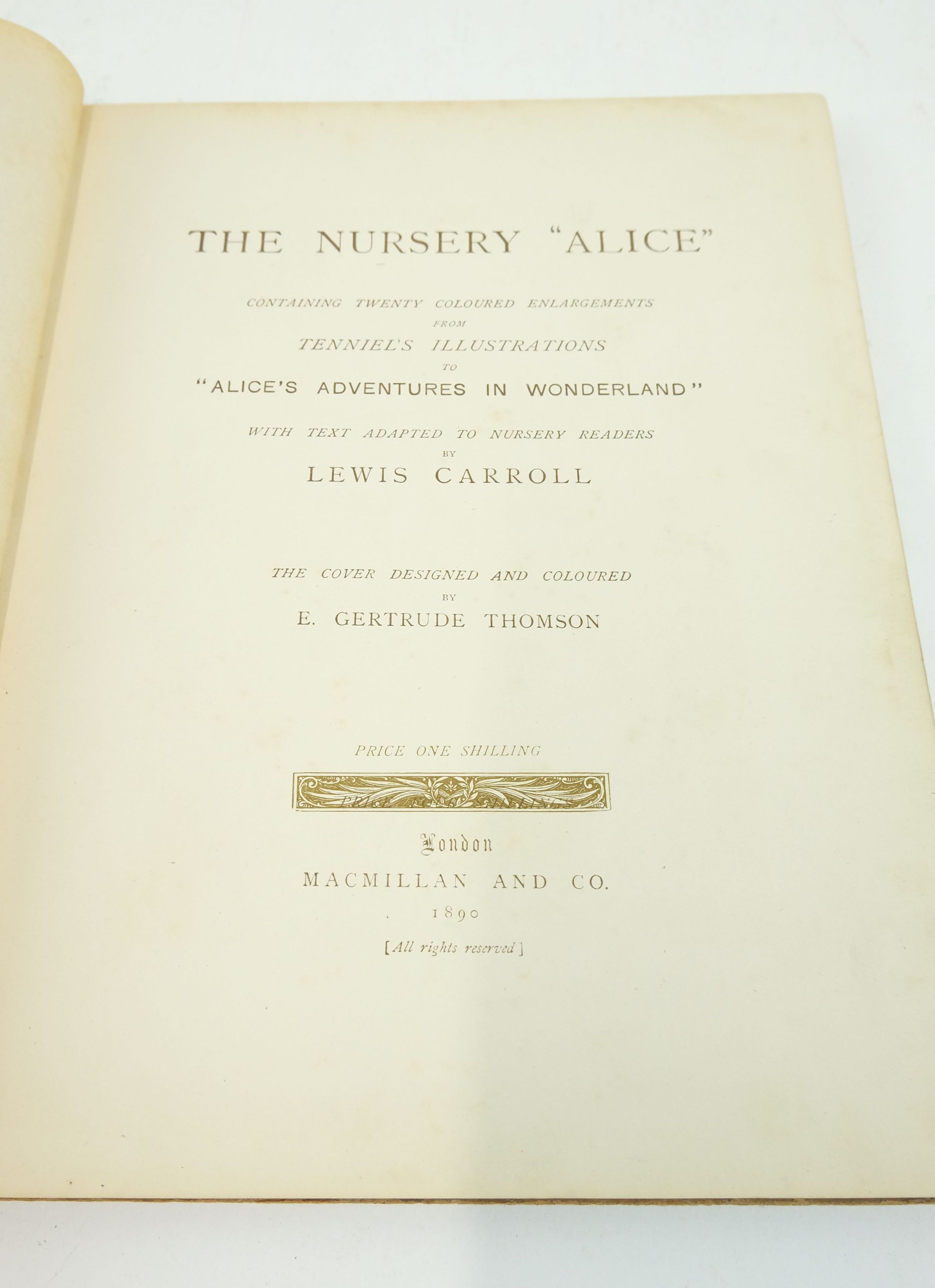 Good condition. Text adapted for nursery readers by Lewis Carroll. Grey cloth spine, pictorial front board. Containing 20 enlarged and coloured versions of Tenniel illustrations, with a cover painted by E. Gertrude Thompson and printed by Edmund Evans, the leading Victorian colour printer. A delightful introduction for the very young to one of the most celebrated characters in children's literature.