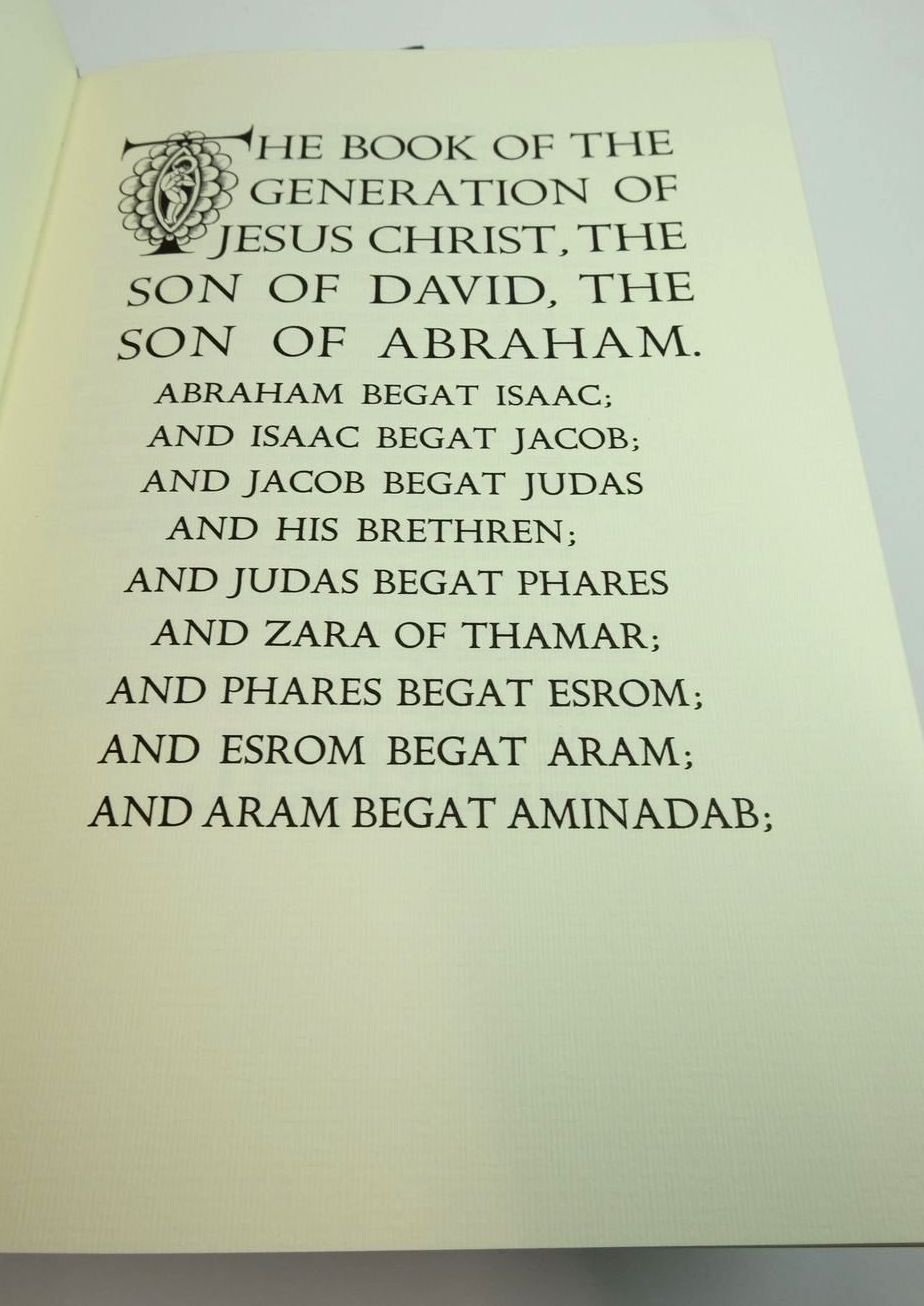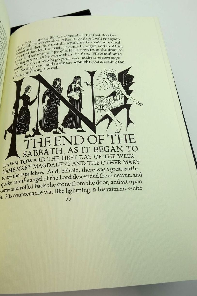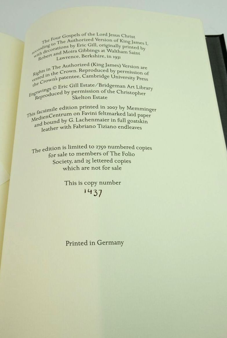 Slightly better than very good condition. Large format. According to the Authorized version of The King James I. This facsimile edition printed in 2007 (originally published in 1931 by The Golden Cockerel Press), by Memminger MedienCentrum on Favini feltmarked laid paper and bound by G. Lachenmaier in full goatskin leather with Fabriano Tiziano endleaves. All edges gilt. This edition is Limited to 2750 numbered copies. Contained in solamander case, with gilt title to spine. This edition also includes a thin volume of Essays by Dreyfus & Gibbings.
