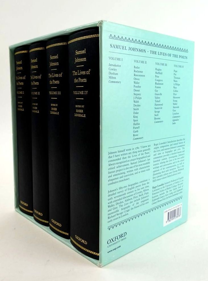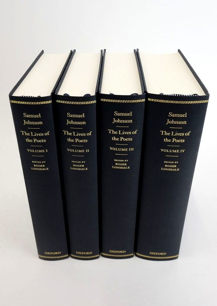 Nearly fine condition. Fifty-two biographies constituting a detailed survey of English poetry from the early seventeenth century to Johnson's own time. Introduction by Roger Lonsdale. Four volumes. Navy blue cloth with gilt title to spines.