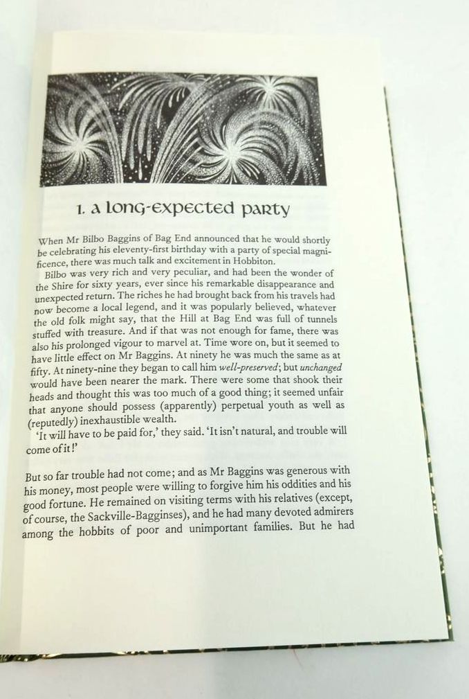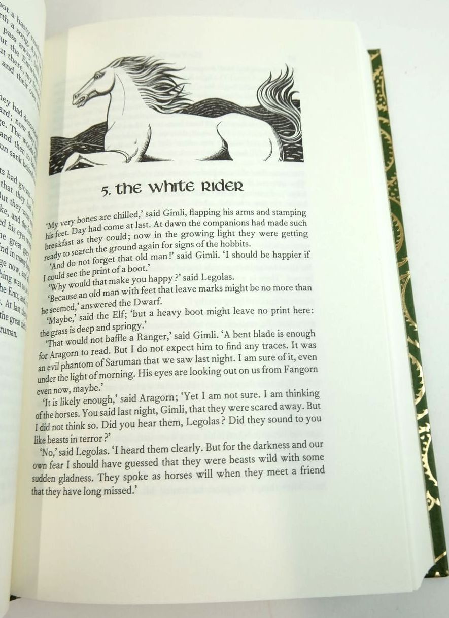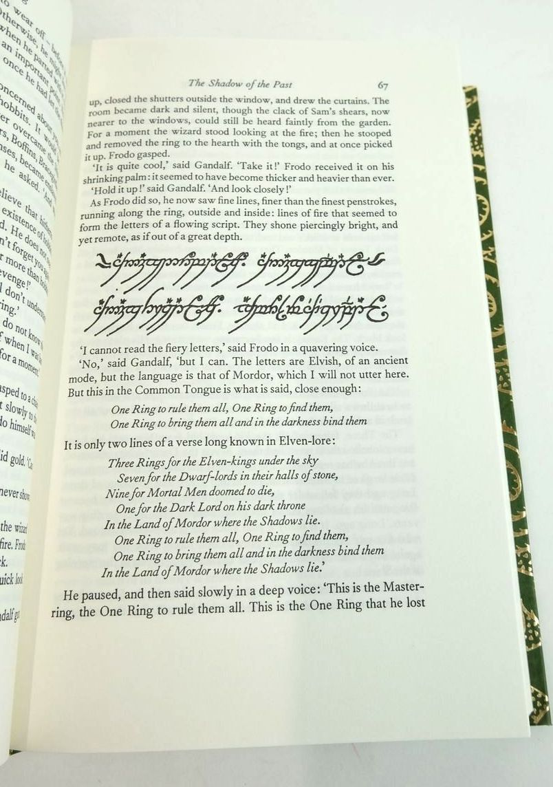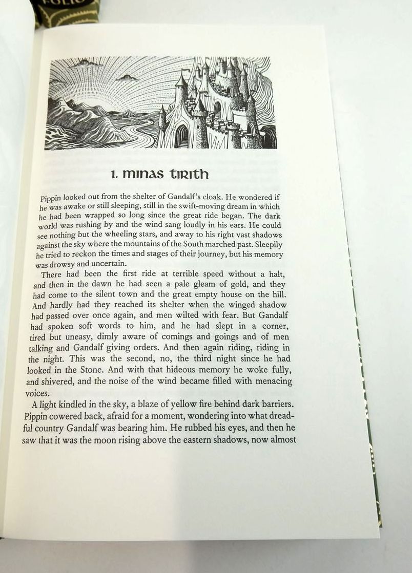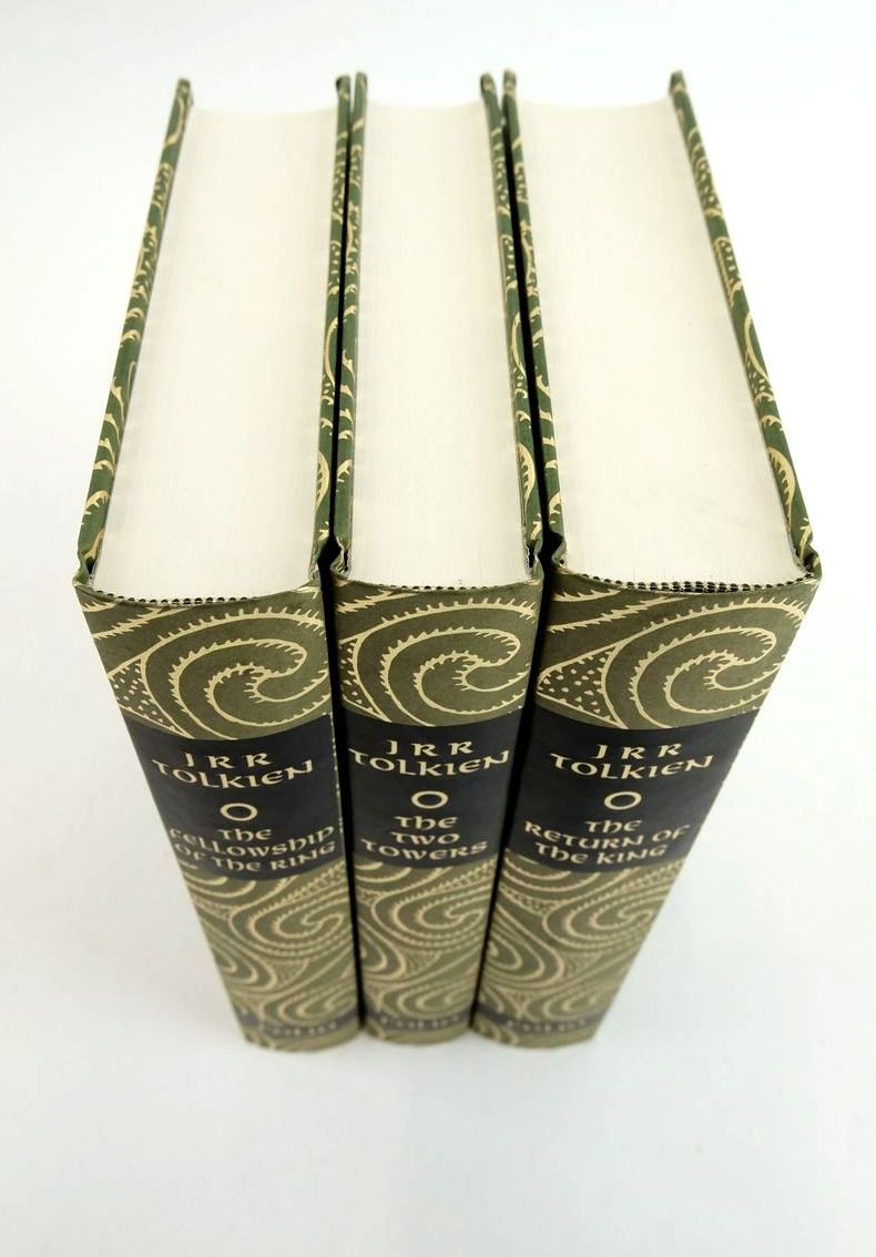 Slightly better than very good condition. Three volumes: The Fellowship of the Ring; The Two Towers; The Return of the King. Reissue Folio edition, with new binding. Green boards, gilt title to spine and gilt pattern to green boards. Circular pictures to front covers.