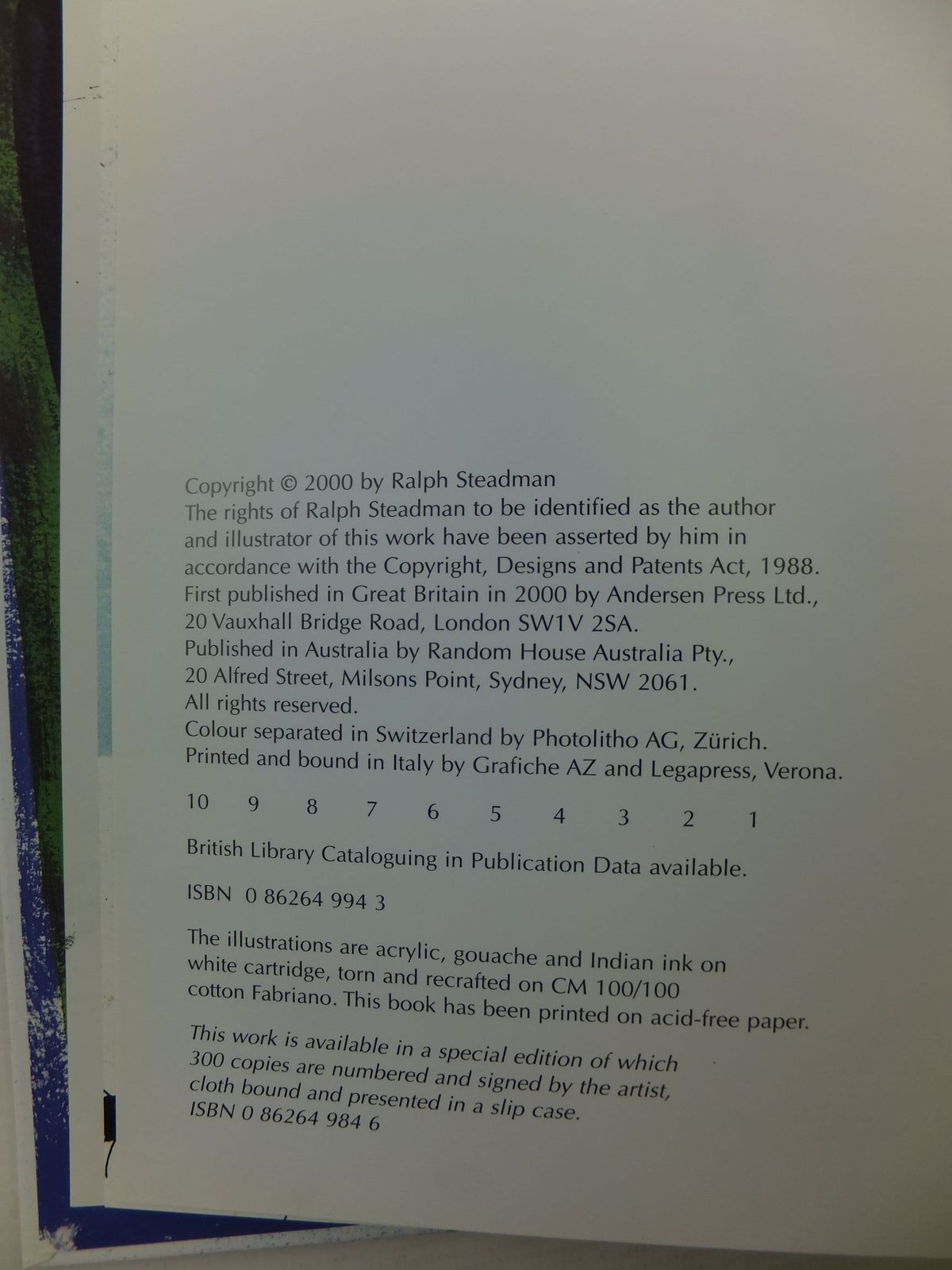 SIGNED by artist, with original ink drawing by Steadman to same page (verso of front endpaper). A few splashes of ink from the drawing have got onto covers. This copy would make a wonderful gift.