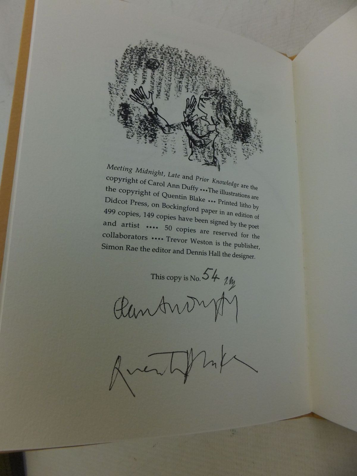 Fine condition. Carol Ann Duffy's first collection of poetry for younger readers. B/w illustrations. Signed, Limited edition of 499 copies. Printed litho by Didcot Press on Bockingford Paper. B/w illustrations. Edited by Simon Rae