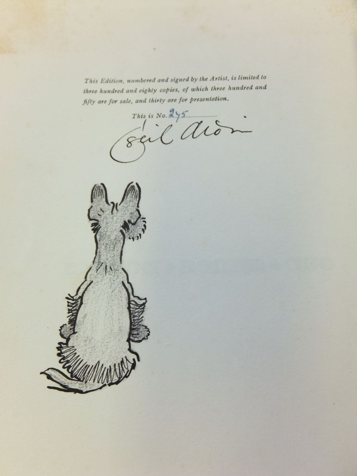 SIGNED by illustrator to prelims; with original pen sketch of a dog. This is copy no. 275. Some grubby marks to vellum spine. Browning and some marks and wear to cover edges. Some foxing and page browning; foxing heaviest to outer page edges.