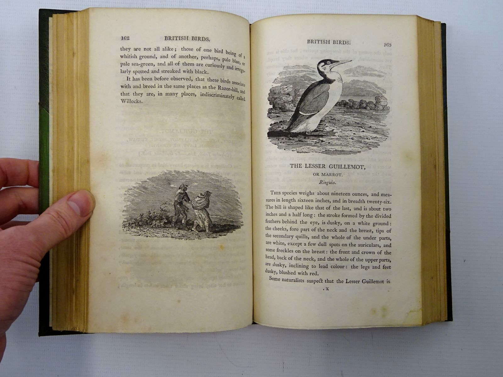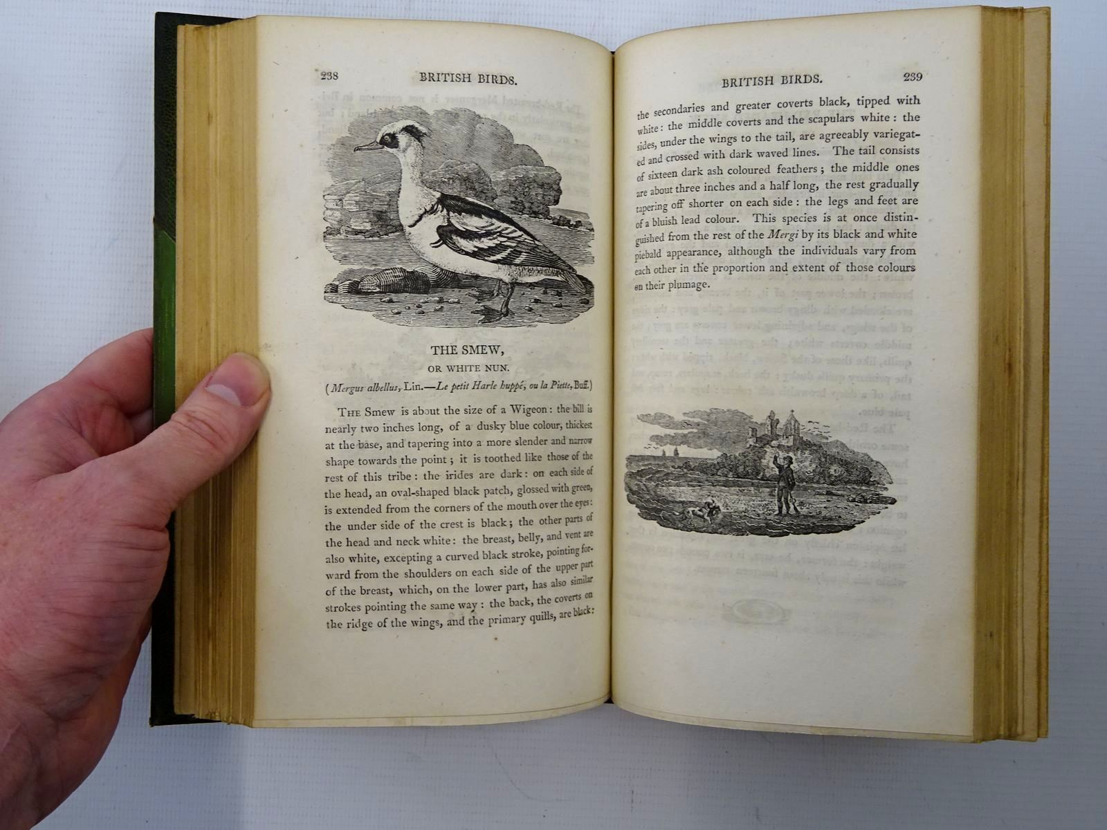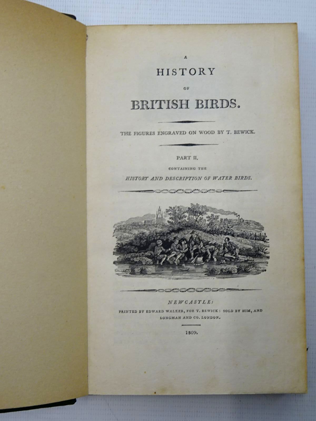 Very good condition. Two volumes, green leather spine and corners, raised bands, gilt titles and decorations on spine. Newcastle, printed by Edward Walker for R.E. Bewick; sold by him and Longman and Co. London. Vol I Land Birds; Vol II Water Birds. Wood engravings by Bewick.
