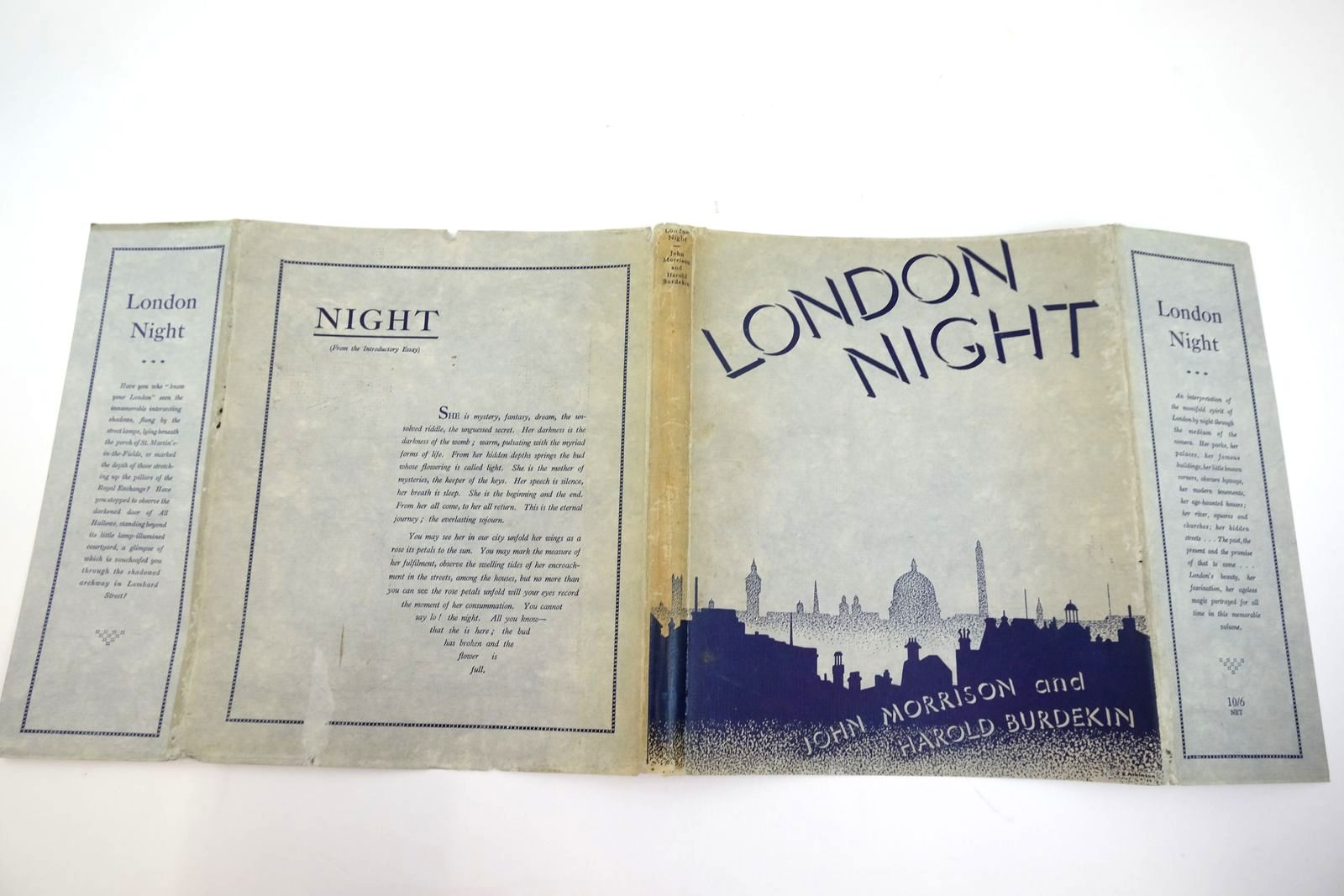 Very good condition in a almost very good dustwrapper. Large format. Dark blue cloth with silver titles and little stars. An interpretation of the manifold spirit of London by night through the medium of the camera. Introductory essay by Morrison. Fifty photographic studies by Harold Burdekin.