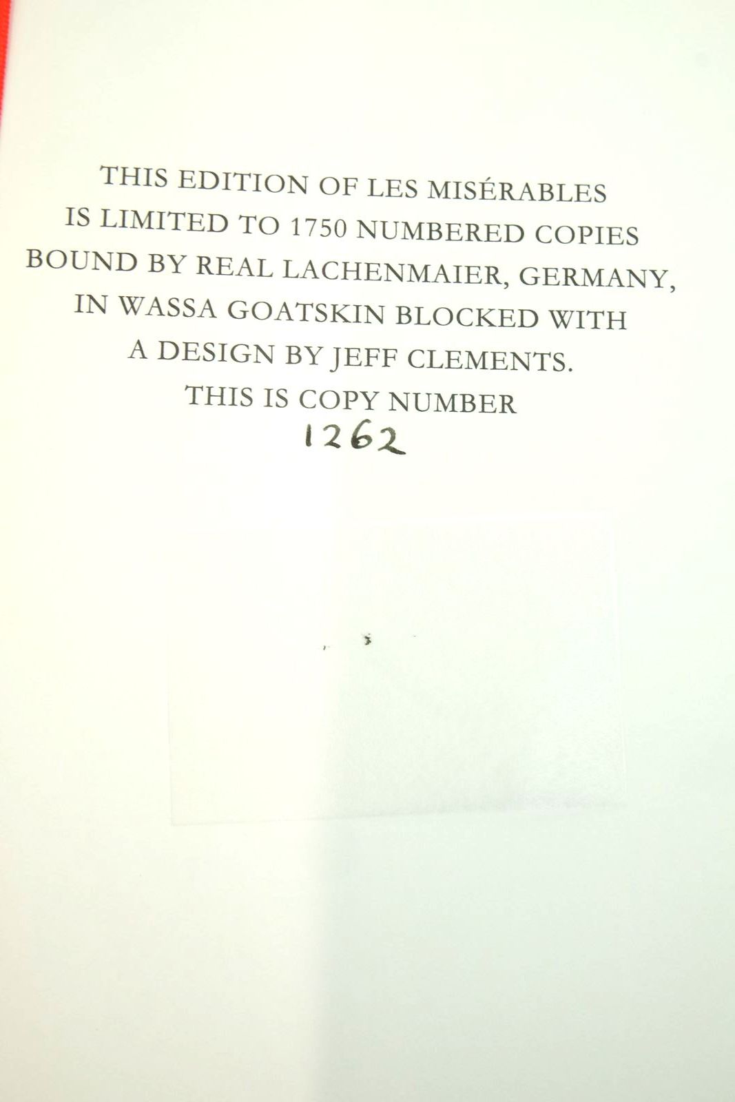 Fine condition. Limited edition of 1750 numbered copies. Translated and with an introduction by Norman Denny. Blue goatskin leather, gilt title to spine, blocked design in red and gilt to spine and sides. Top edge gilt. Red ribbon page marker. Red endpapers. B/w illustrations from designs by De Neuville, Bayard, Morin, Valnay and other eminent French artists. xvii and 1101 pages. Also includes an essay bound as a red cardwrap booklet entitled 'The Divine Stenographer Truth and Narration in Les Miserables'.